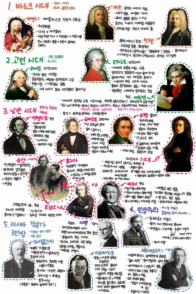 4악장은 인상주의와 20세기 음악으로 이어진다. 드뷔시와 라벨을 중심으로 한 색채와 분위기 중심의 음악, 러시아 작곡가 3인방인 차이콥스키, 라흐마니노프, 스트라빈스키의 음악적 실험과 발레음악 혁신까지, 클래식 음악의 다양성과 진화를 입체적으로 보여준다. 단순한 작품 감상을 넘어 시대별 음악 스타일의 변화와 작곡가들의 고민까지 이해할 수 있다.