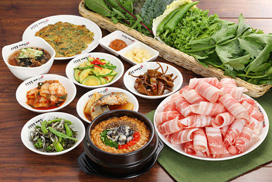 잘 구운 대패삼겹살과 함께 우렁쌈, 다양한 반찬이 한 상 가득 차려진다.
