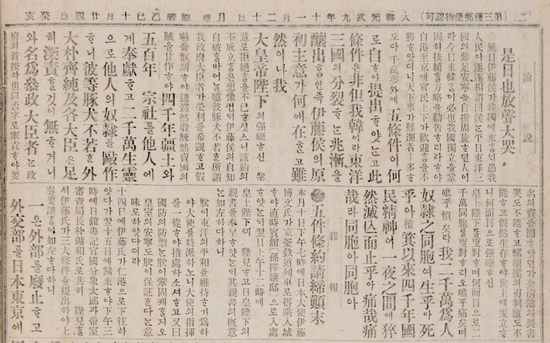 1905년 11월 20일자 『황성신문』에 실린 장지연의 논설 〈시일야방성대곡(是日也放聲大哭)〉이다. 논설 제목의 뜻은 ‘이날을 목놓아 우노라’이다. 일제가 1905년 11월 을사늑약을 강제한 것을 규탄하고, 박제순(朴齊純) 등 조약에 찬동한 이른바 ‘을사오적(乙巳五賊)이 ‘4천년 강토와 5백년 종사’를 일본에 바쳤다고 맹비난하였다. 일제는 이 논설을 구실로 『황성신문』을 정간시켰다. (사진제공=우리역사넷)