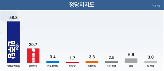 정당 지지도는 더불어민주당이 58.8%, 국민의힘이 20.7%를 기록했다. 이어 조국혁신당(3.4%), 개혁신당(3.3%), 진보당(1.7%) 순이었다.